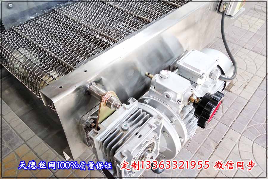 網(wǎng)帶輸送機(jī)總長5米,輸送機(jī)總高度為70公分,輸送機(jī)的總寬度為600毫米。整機(jī)采用不銹鋼304材質(zhì),輸送部分采用鋼絲編織型金屬輸送帶,輸送帶總長為10米,總寬度為500毫米,鋼絲編織的孔徑為5*15毫米,穿桿直徑為8毫米,鏈節(jié)距為38.1毫米,桿與桿之間的距離為150毫米左右。特別要求電機(jī)外要采用防雨罩罩起來,網(wǎng)帶輸送機(jī)上面要安裝排風(fēng)扇,排風(fēng)扇離著金屬輸送帶要有30公分的距離,整機(jī)采用活動(dòng)腳安裝,方便挪動(dòng)。整條輸送機(jī)下面安裝一個(gè)托盤,托盤可移動(dòng),用來接住瀝出來的油。