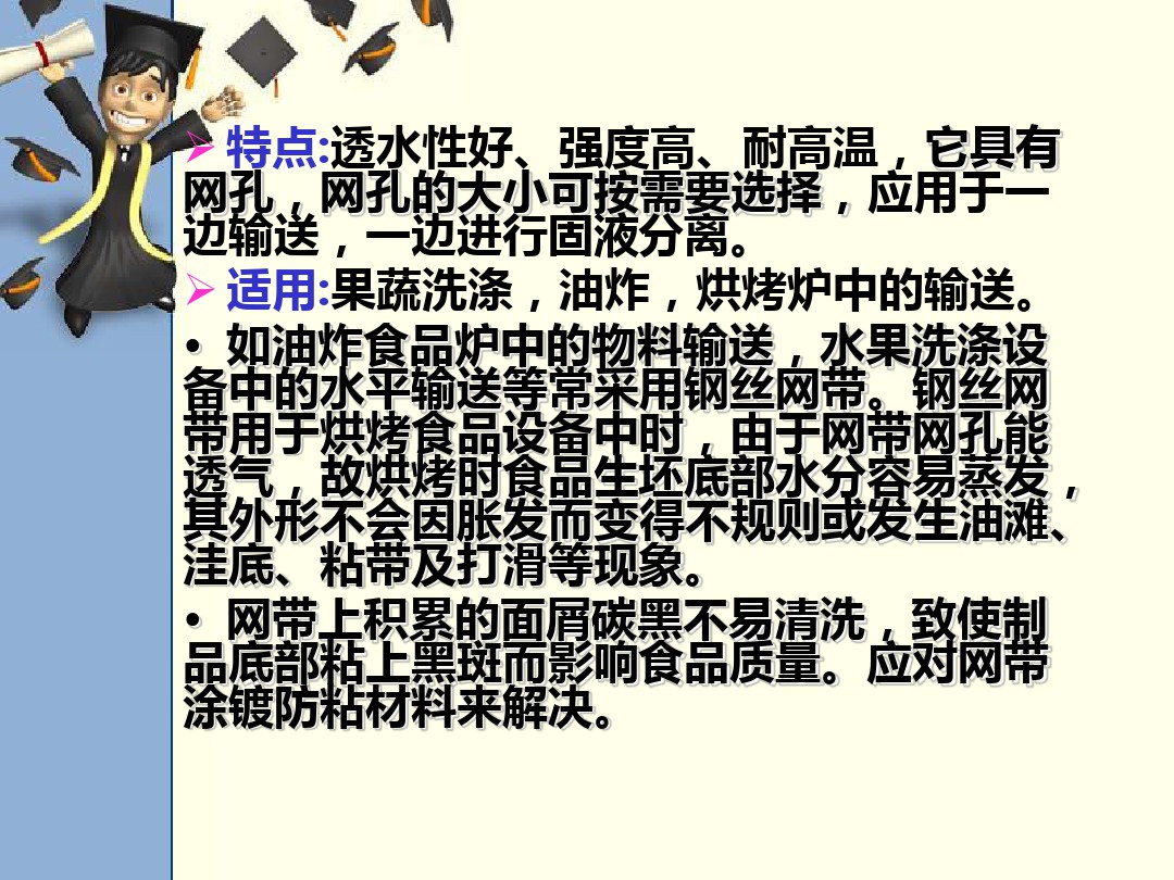 網帶上累積的面屑炭黑不易清洗,致使制品底部粘上黑斑而影響食品質量。應對網帶涂鍍防粘材料來解決。