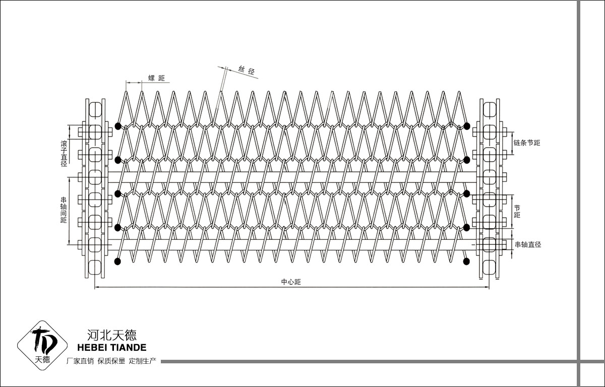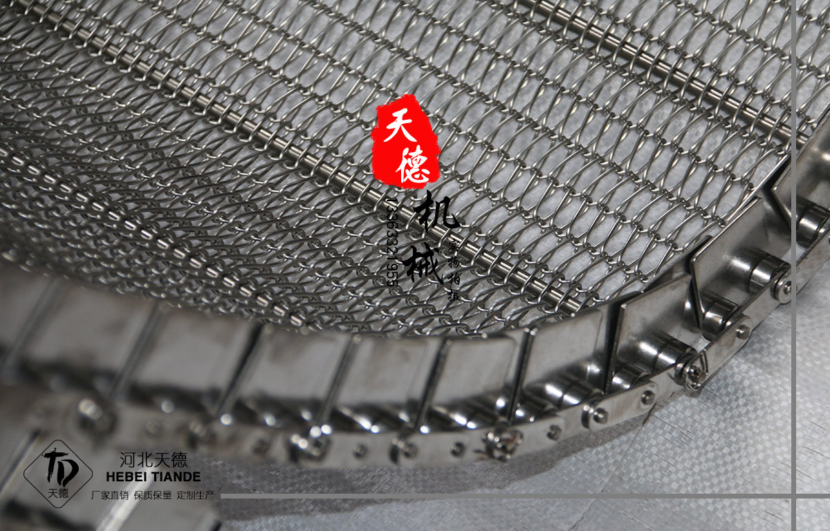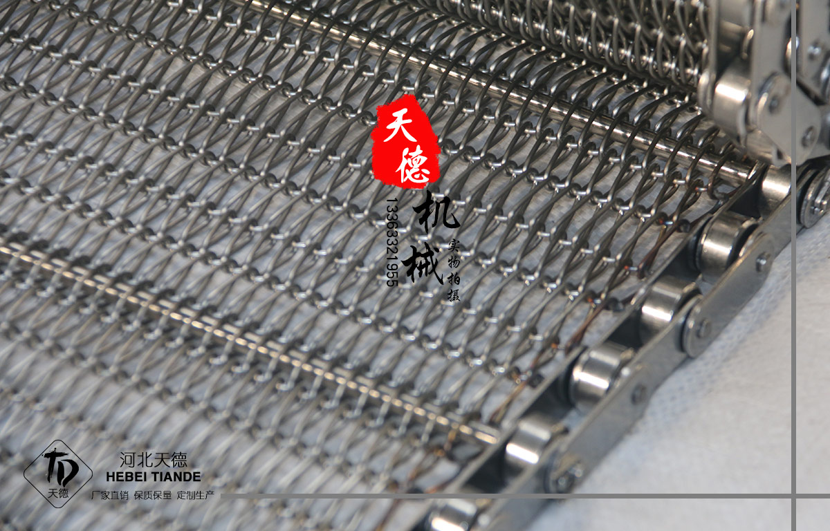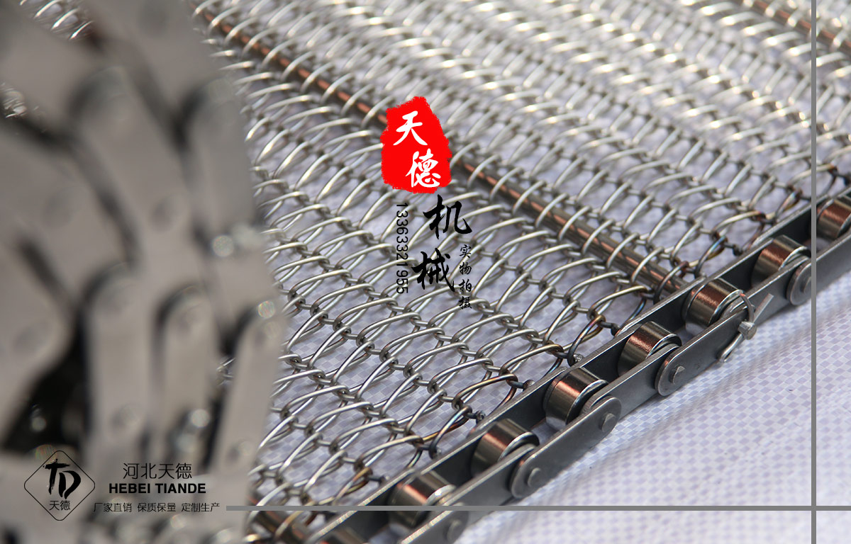 網帶都采用軋牙串條、左右網條二根串,并大小網條連接而成,大網條內穿進小軸,小軸二端穿入鏈條孔,從而達到鏈條驅動輸送網帶。鏈條網傳動平穩、傳動力矩小。