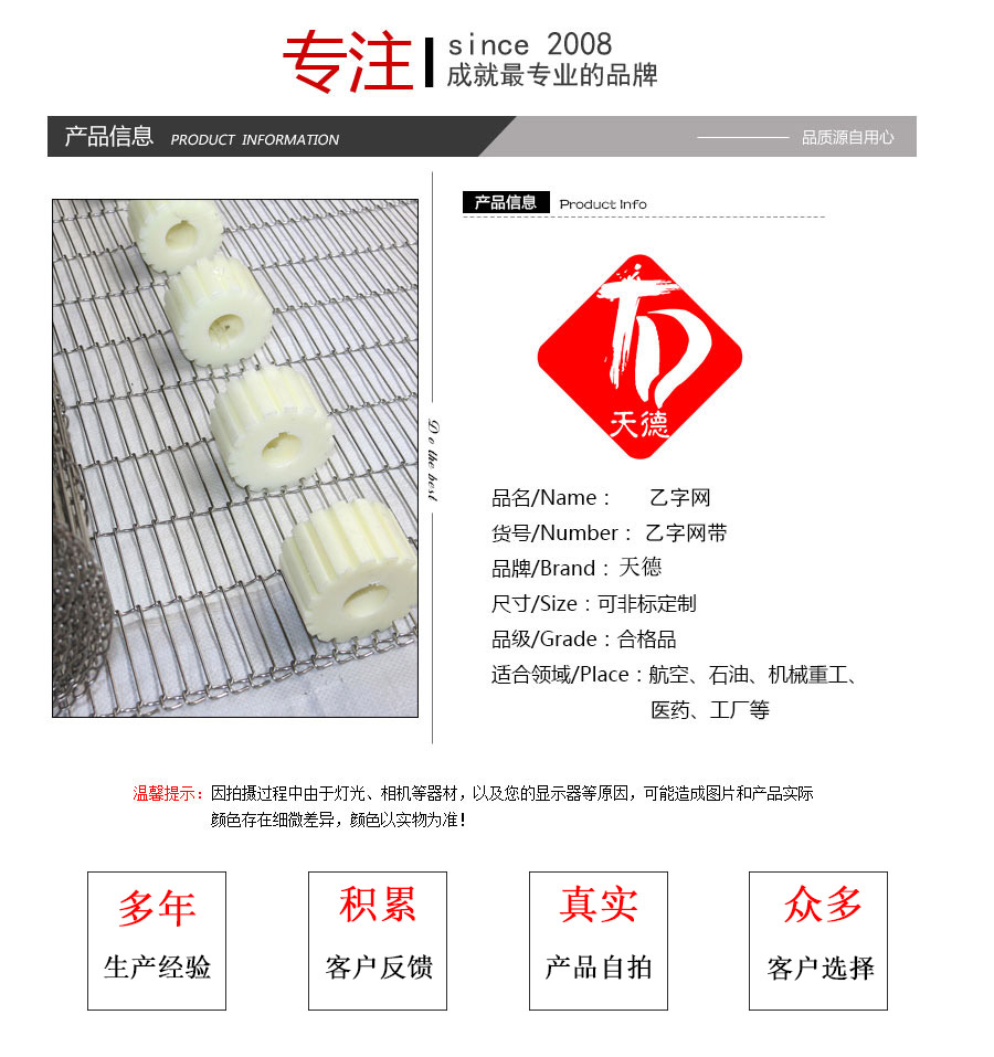 乙字型網帶簡介:乙字型網帶又稱乙型網帶、食品網帶、巧克力網帶,節距分隔一般按用戶要求定制,屬非標準輸送網帶。