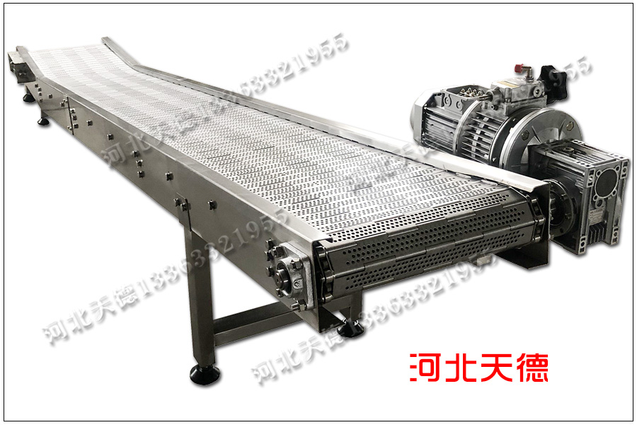 整機采用耐高溫不銹鋼304材質加工,鏈板采用1.2毫米的鋼板通過激光裁剪轉彎加工的,為了透氣鏈板輸送帶的表面進行了打孔處理,